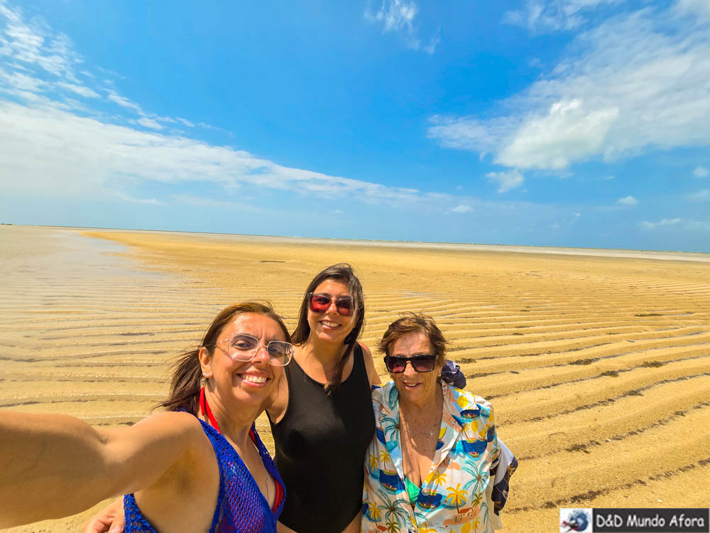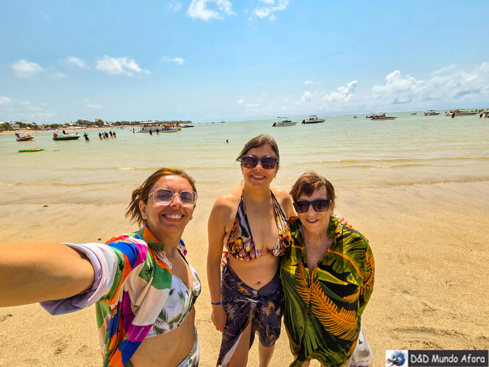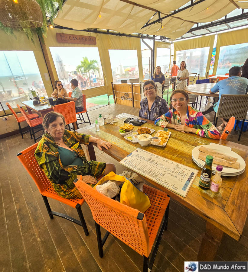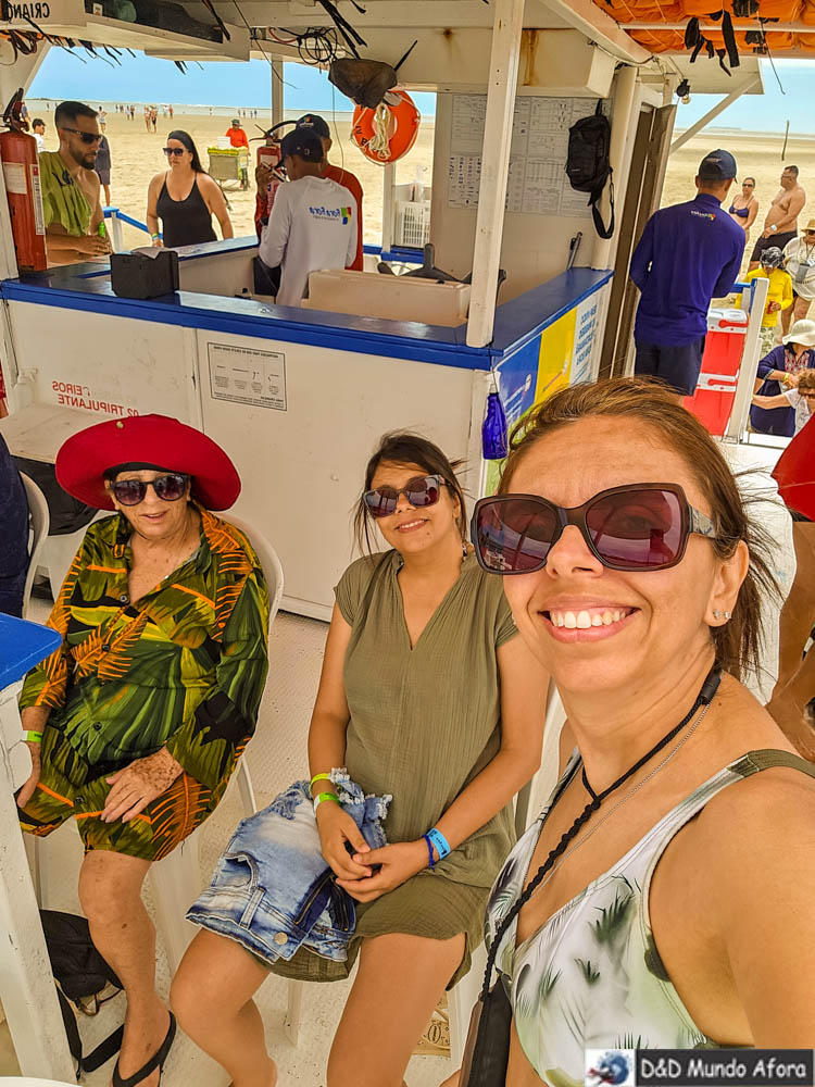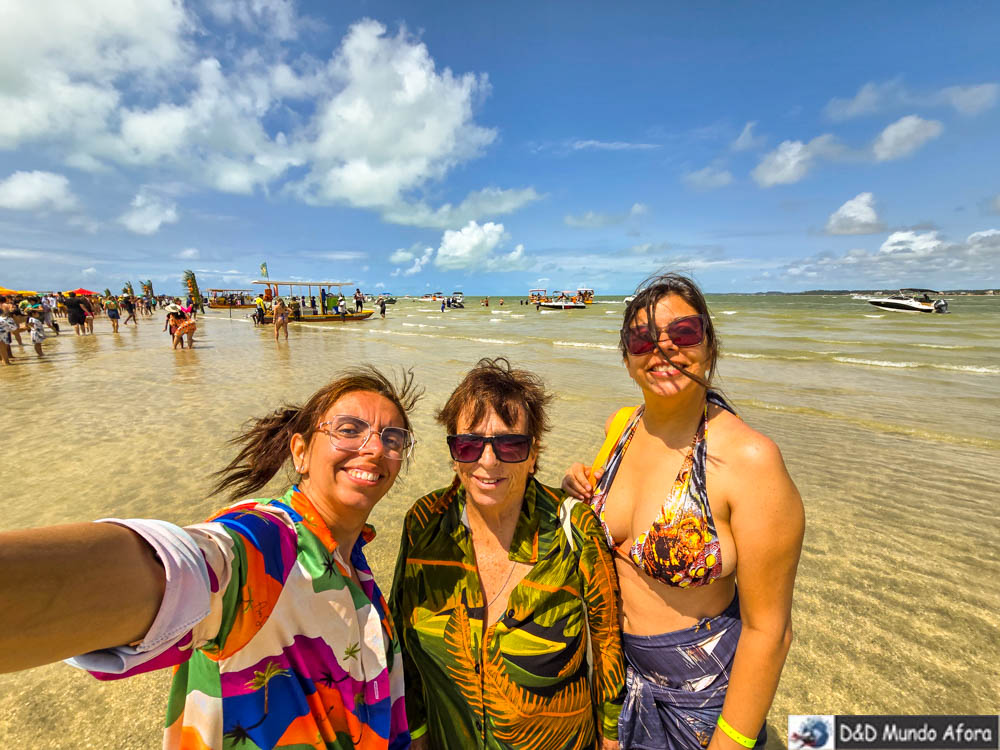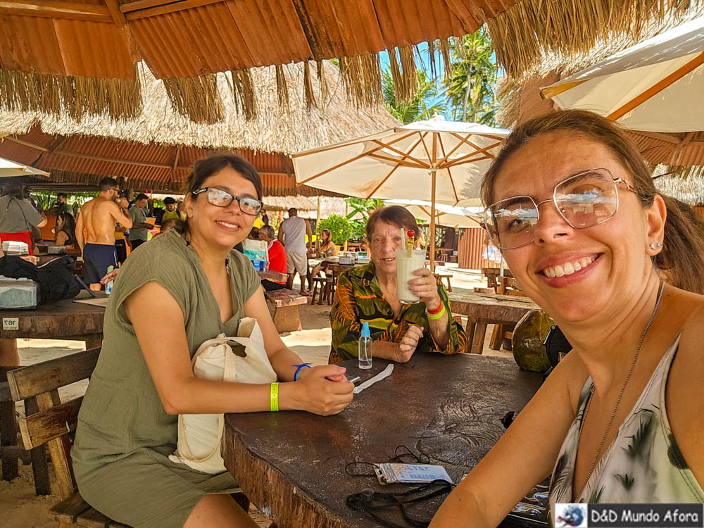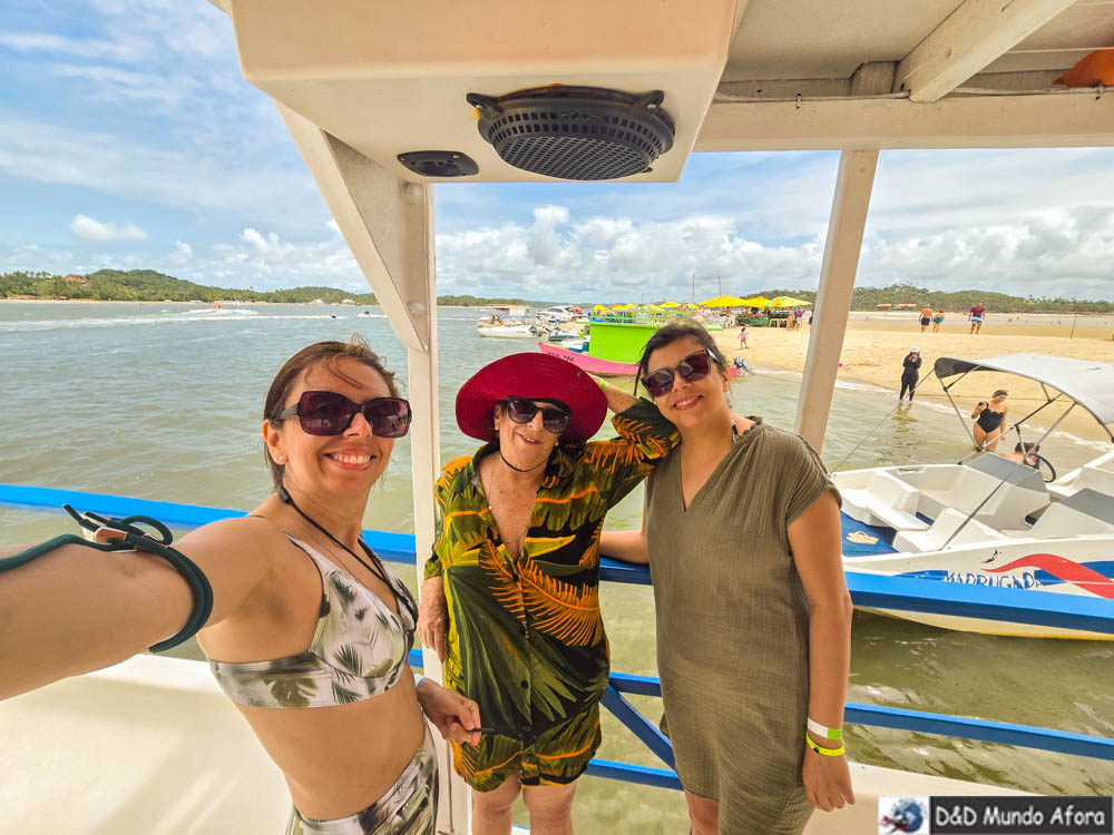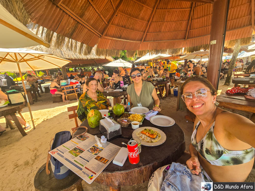 Além de garantir uma mesa excelente, bem próxima à praia, nossa primeira providência foi embarcar no passeio de catamarã. Dessa vez, mamis venceu seus medos e também se juntou a nós — sua primeira experiência desse tipo! Em outras oportunidades, ela costumava nos esperar na praia enquanto eu e Danubia aproveitávamos o passeio. A embarcação, com dois andares e bem estável, facilitou a subida, ainda mais com a maré baixa naquele dia.
