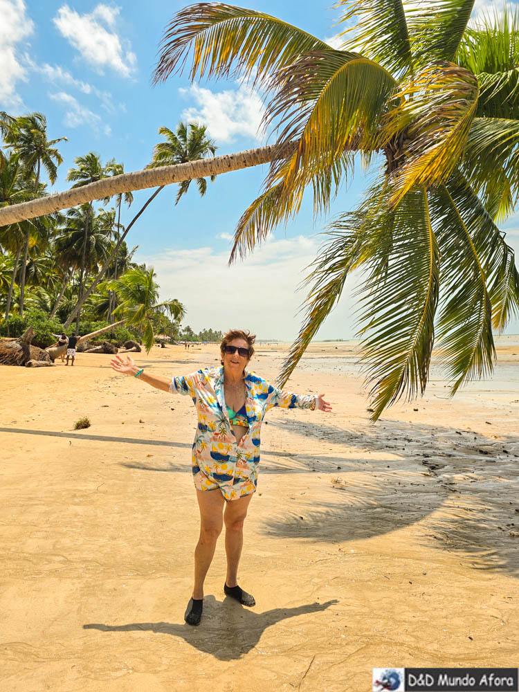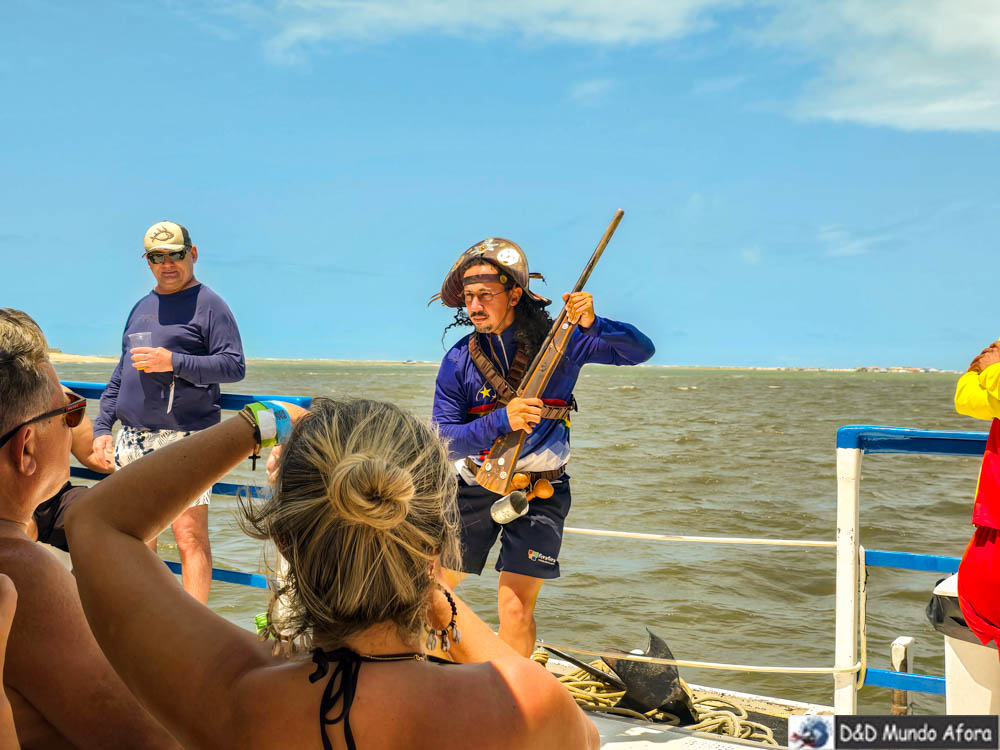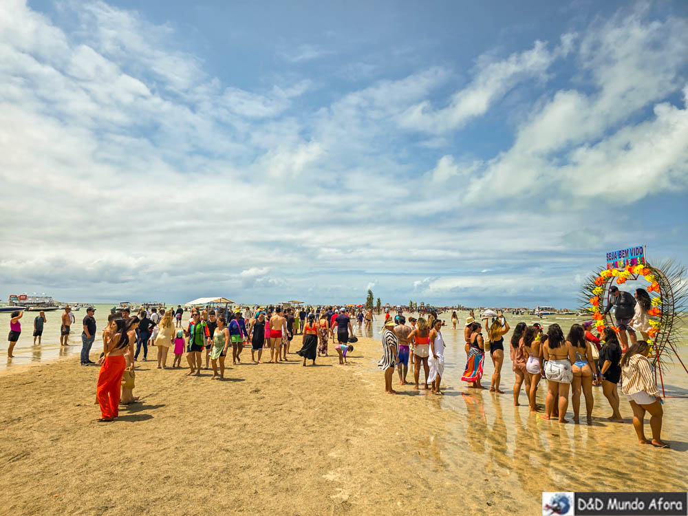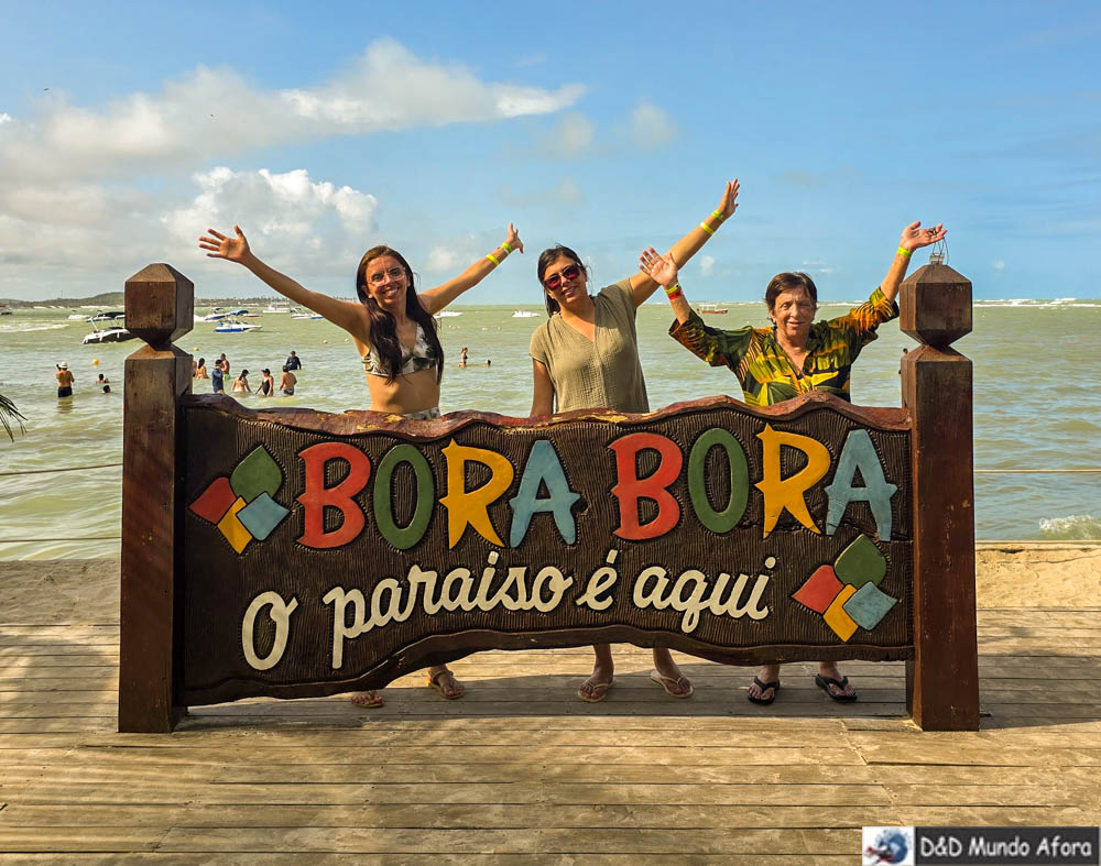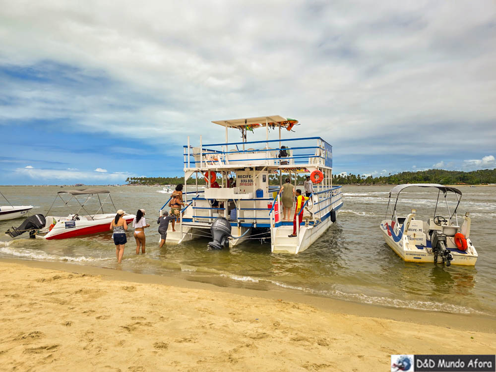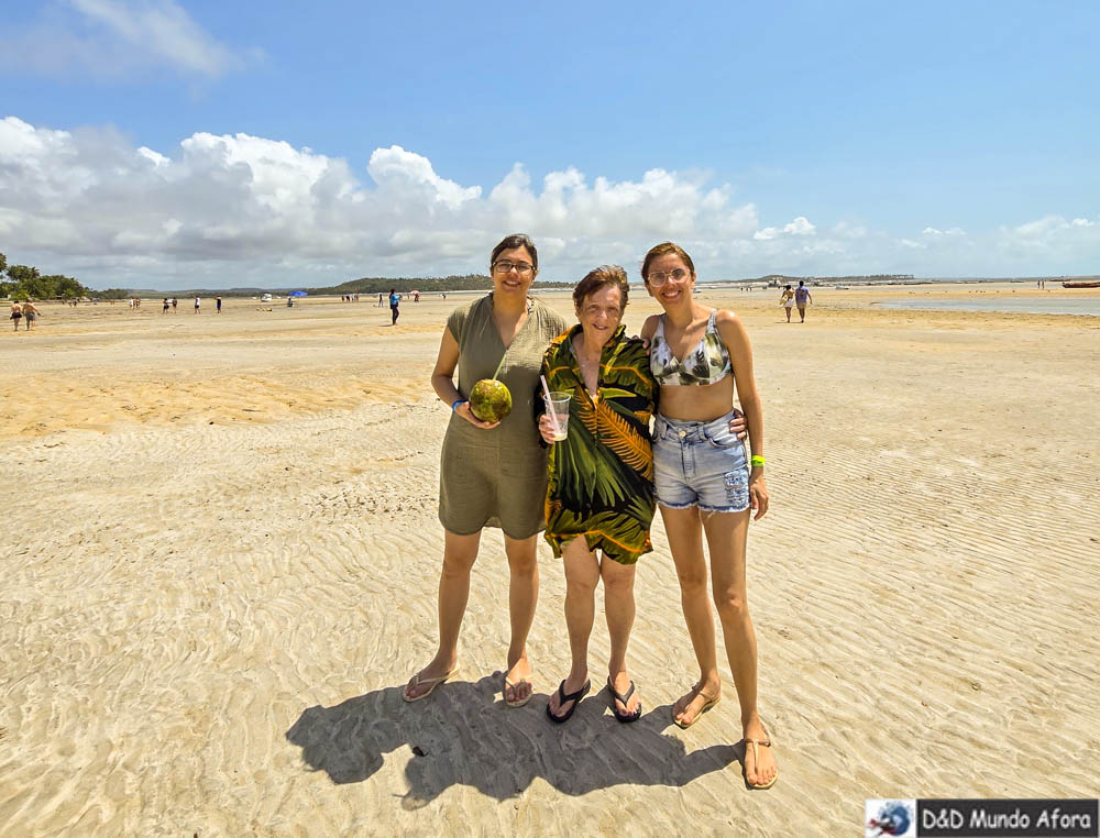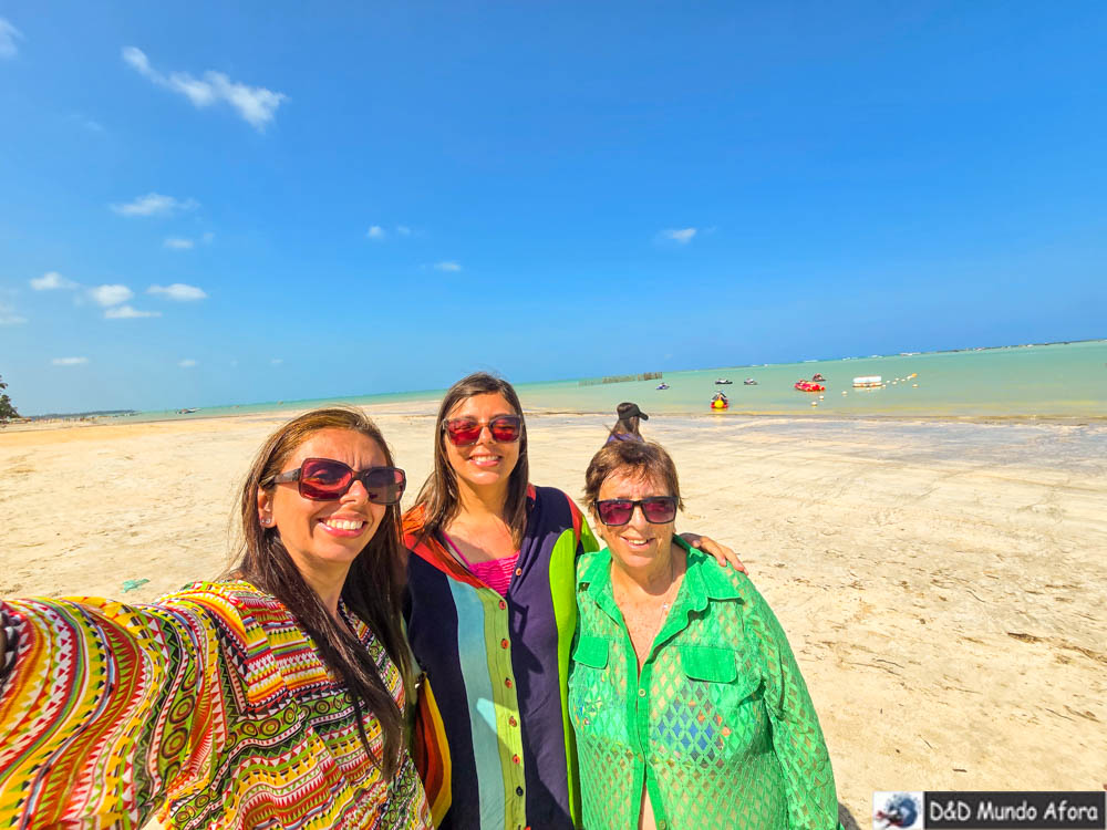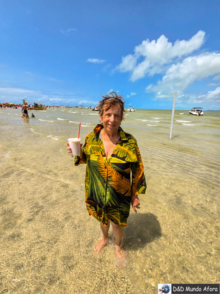 Além de garantir uma mesa excelente, bem próxima à praia, nossa primeira providência foi embarcar no passeio de catamarã. Dessa vez, mamis venceu seus medos e também se juntou a nós — sua primeira experiência desse tipo! Em outras oportunidades, ela costumava nos esperar na praia enquanto eu e Danubia aproveitávamos o passeio. A embarcação, com dois andares e bem estável, facilitou a subida, ainda mais com a maré baixa naquele dia.