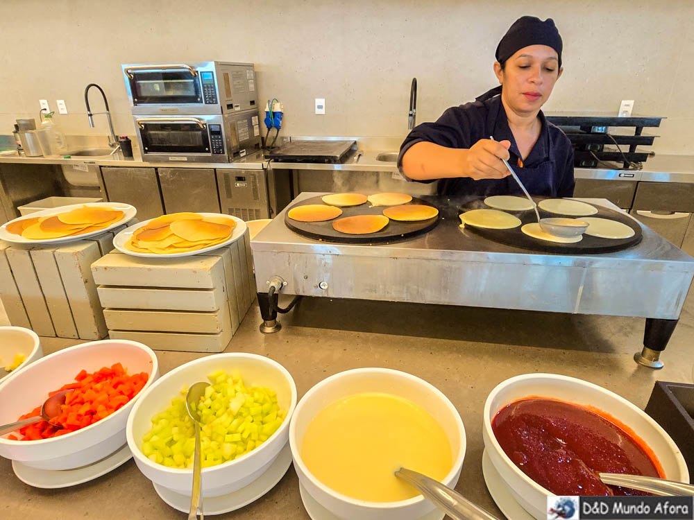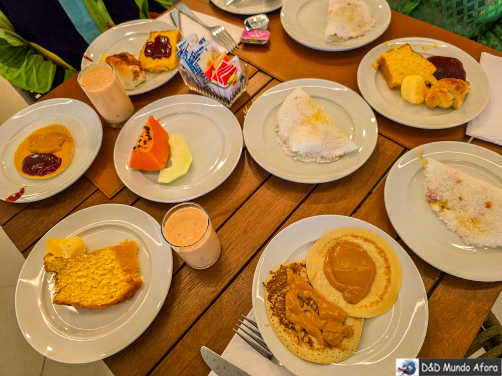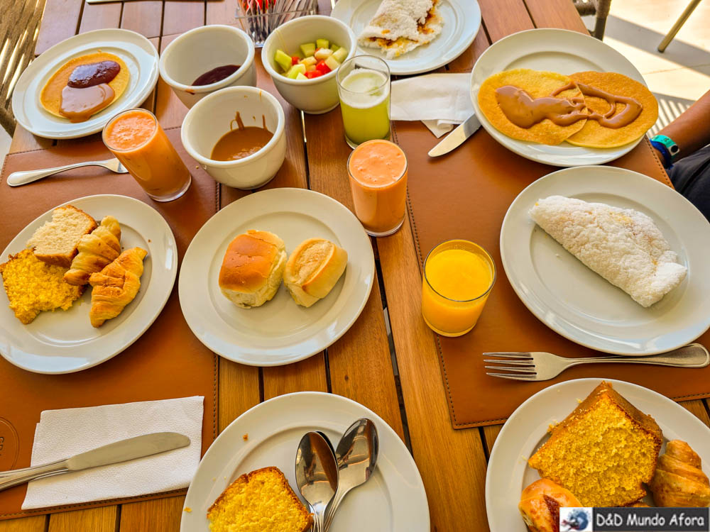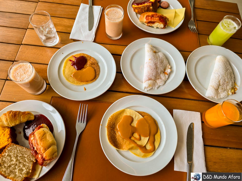 Quando todos levantaram, fomos tomar aquele café delicioso. Tapioca quentinha, feira na hora; panquecas pegando fogo com doce de leite; sucos e vitaminas naturais; bolos; chocolate quente, café e chá; frutas; frios; ovos; omeletes; salsicha, linguiça e bacon; e muito mais.