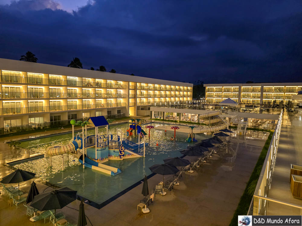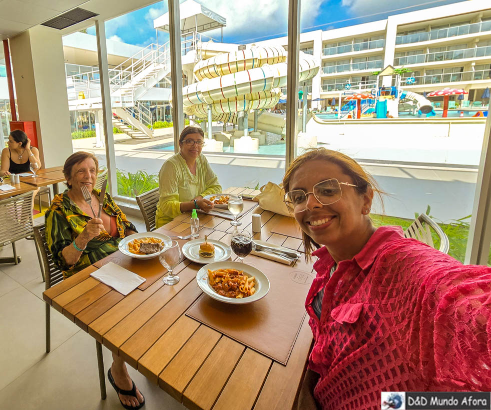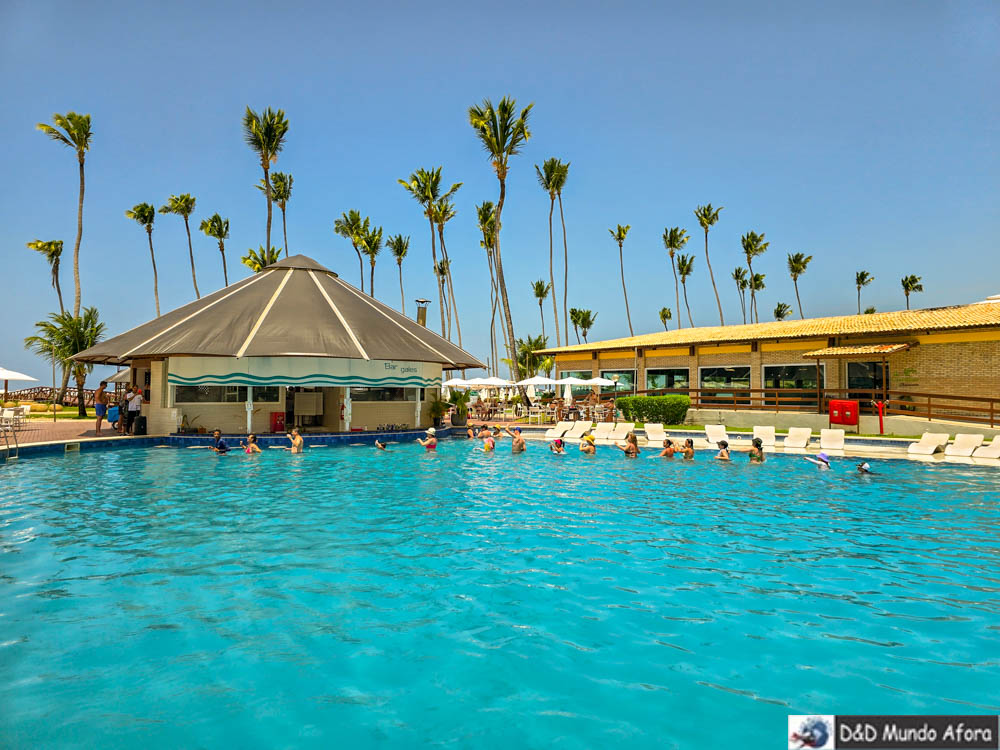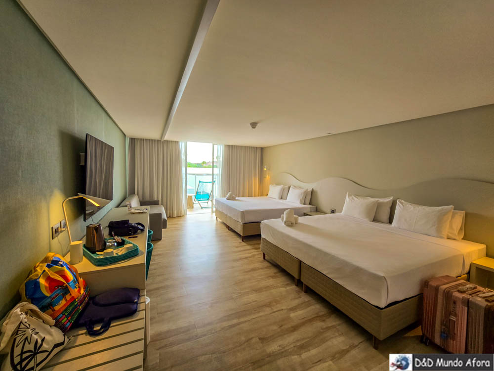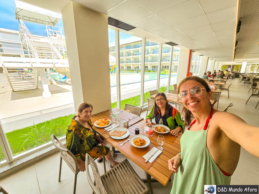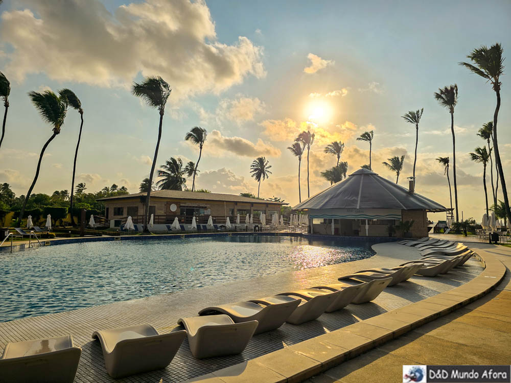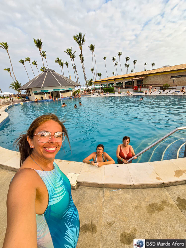 Com as malas guardadas, começamos a aproveitar tudo: piscina, petiscos, bebidas, o mar à frente, parque aquático e todas as comodidades que o resort oferece.
