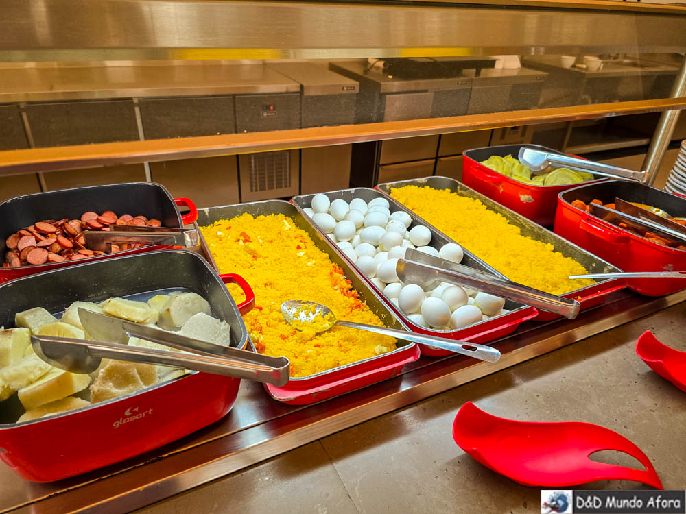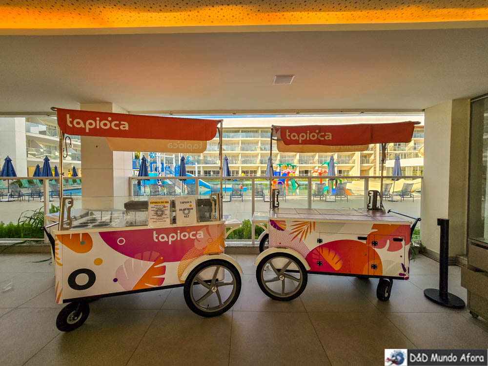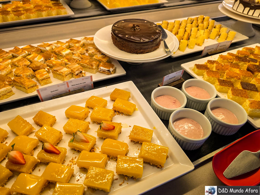 No final do dia, ainda teve espacinho para o lanche da tarde com tapioca, bolos, suco, café, iogurte e outras opções.