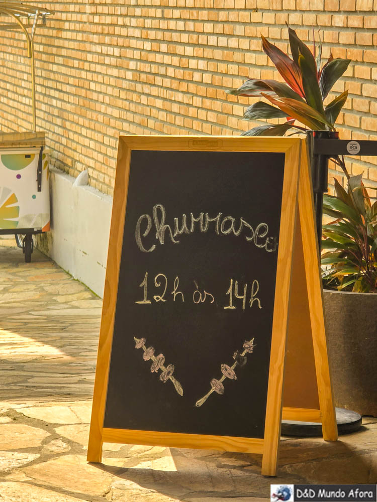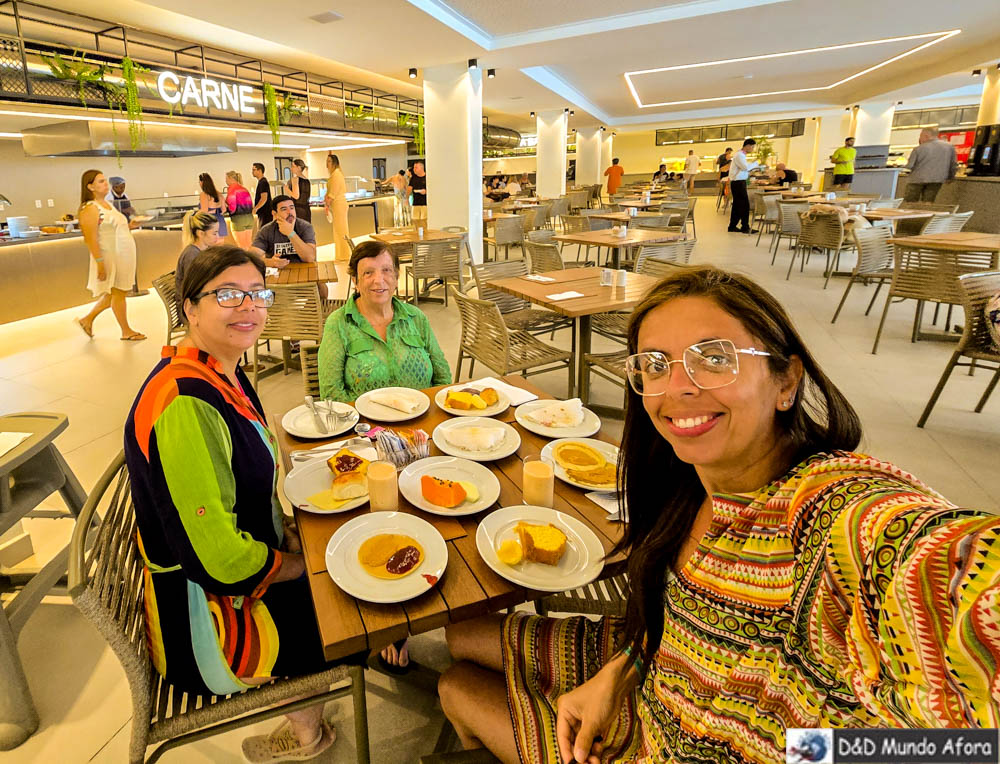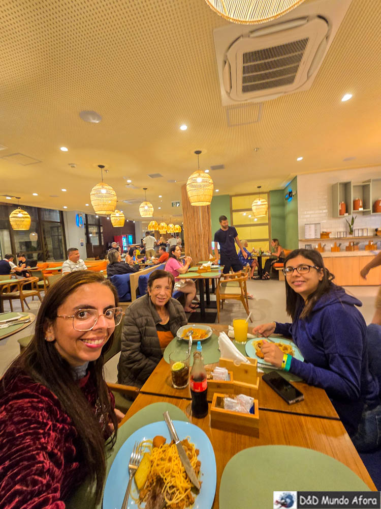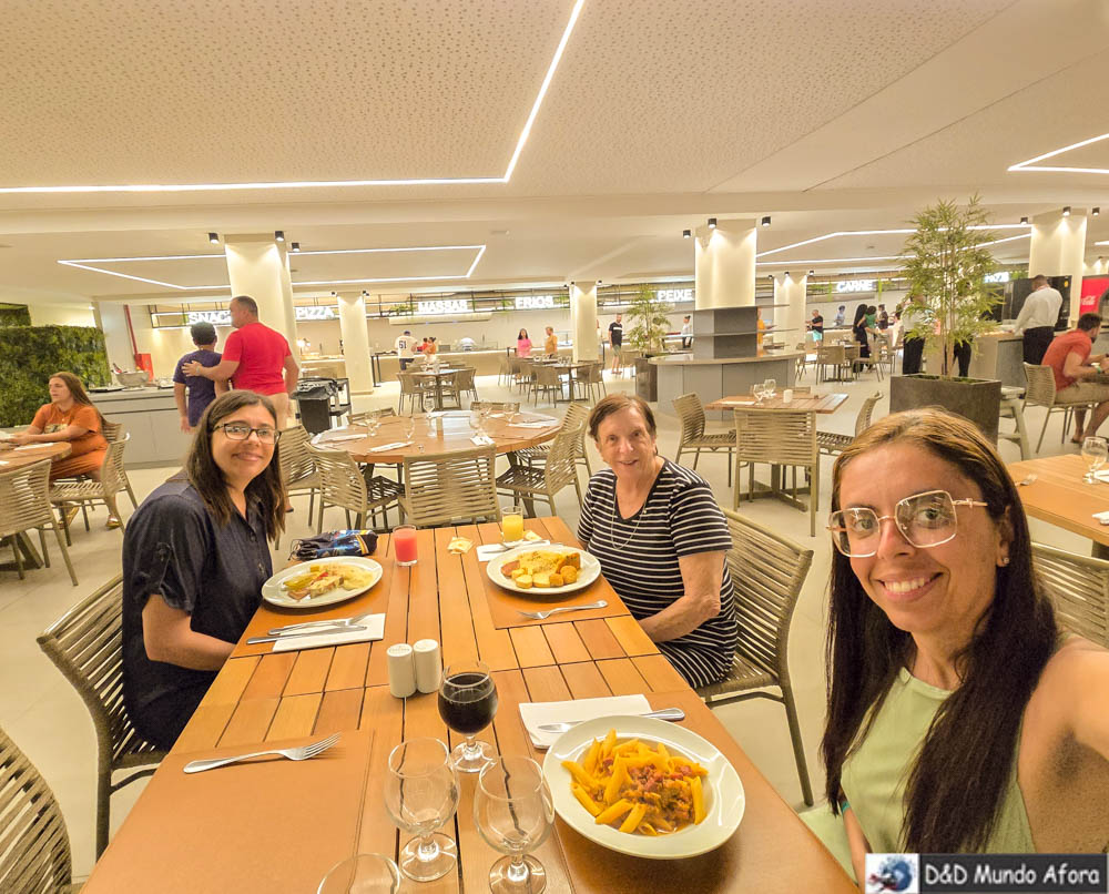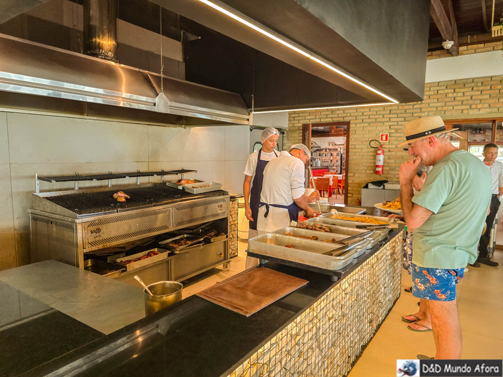 Para o almoço e o jantar, fomos ao restaurante principal, onde a maior dificuldade era escolher entre tantas opções deliciosas. Ah, e ainda rolou churrasco na churrascaria, com carnes assadinhas na hora — servido das 12 às 14 horas.