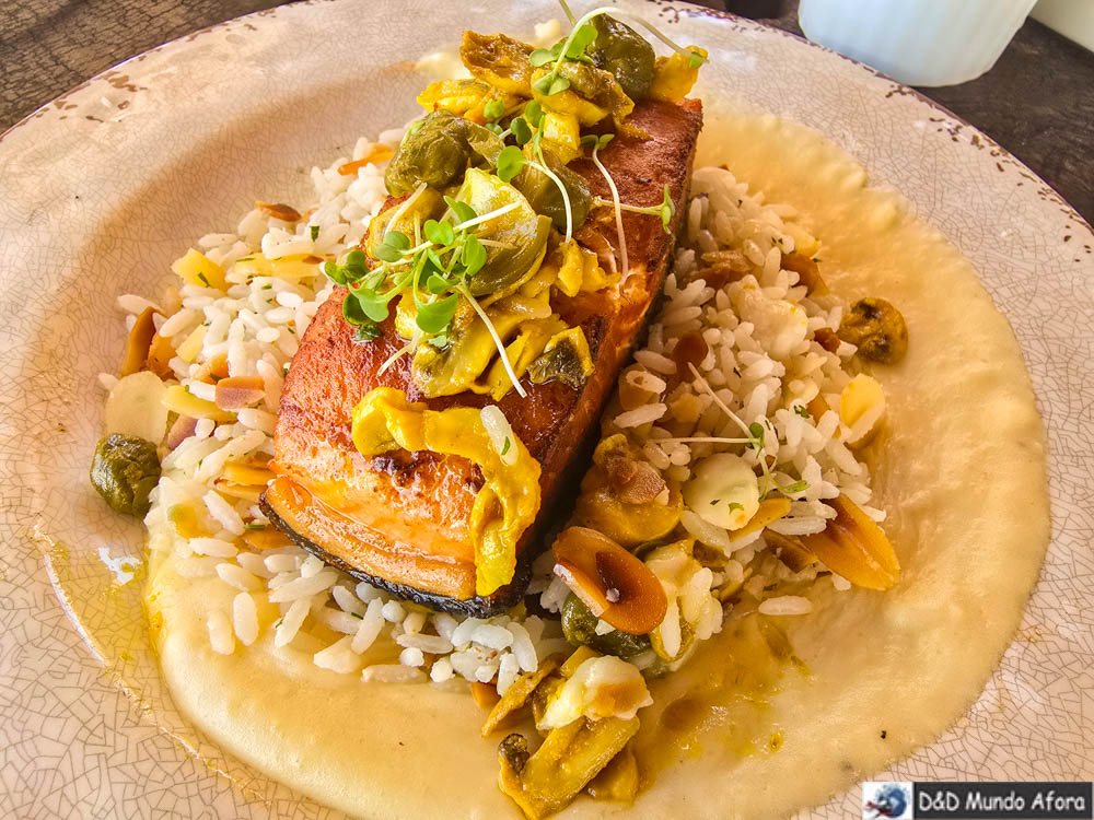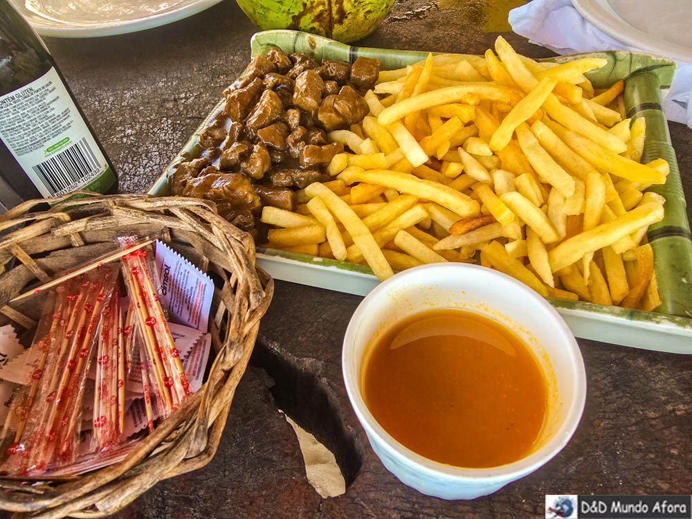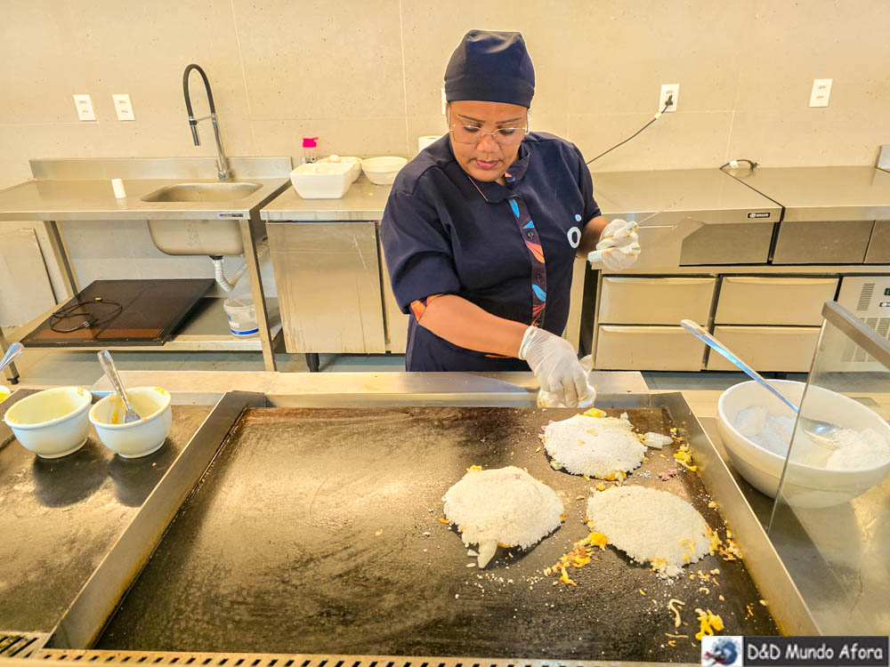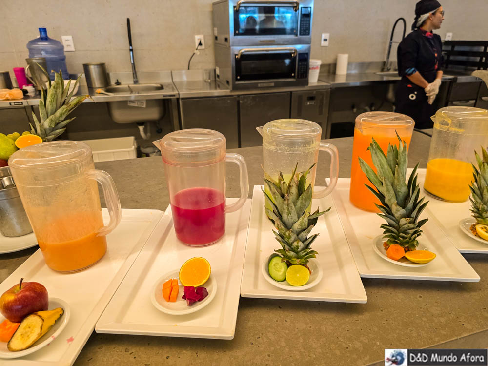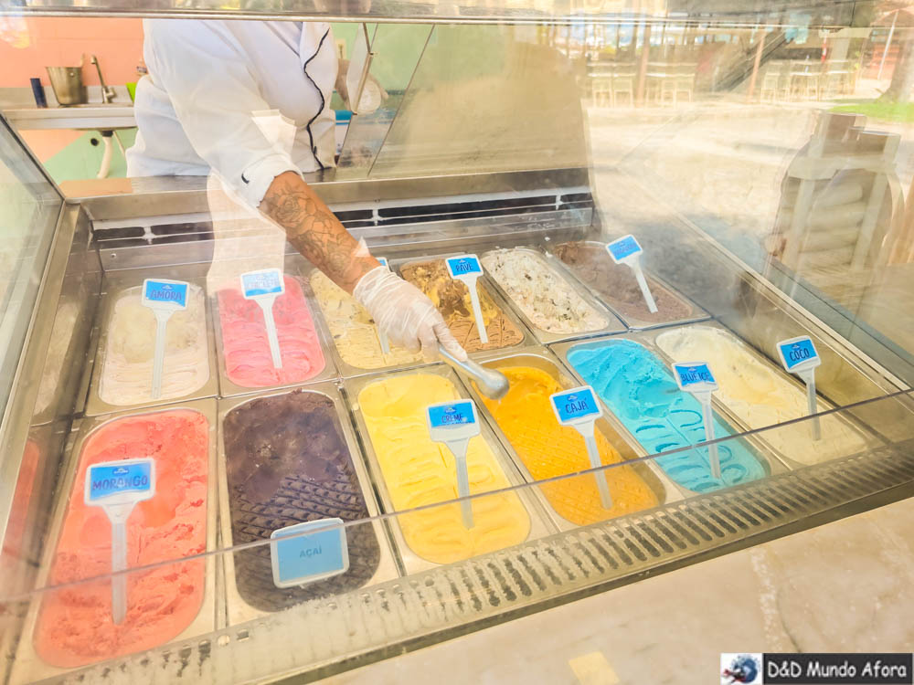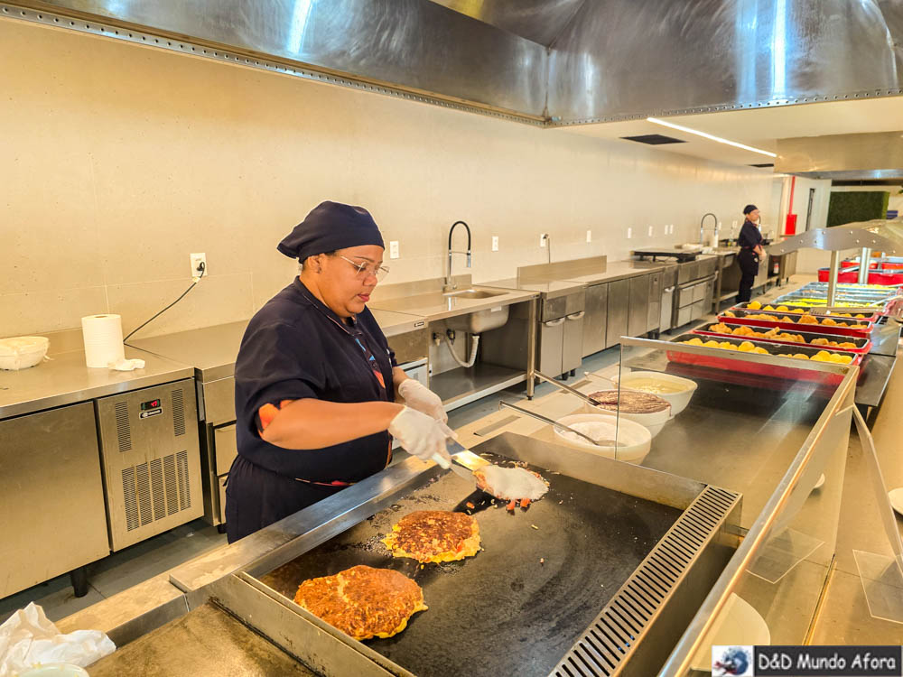 Para o almoço e o jantar, fomos ao restaurante principal, onde a maior dificuldade era escolher entre tantas opções deliciosas. Ah, e ainda rolou churrasco na churrascaria, com carnes assadinhas na hora — servido das 12 às 14 horas.