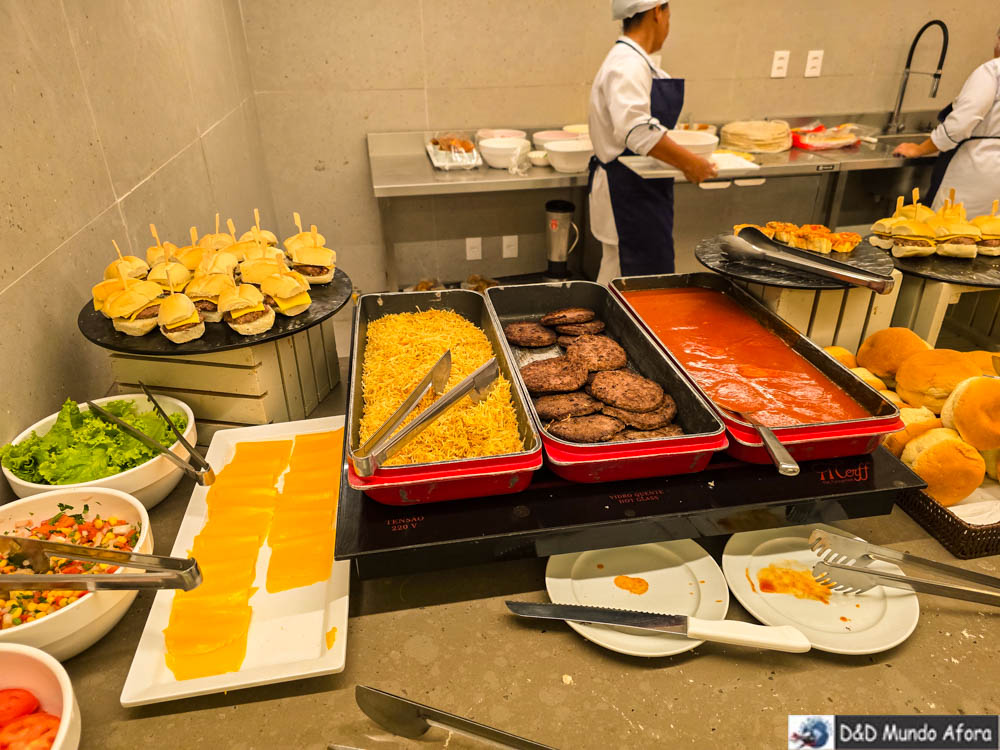 Para encerrar o dia, aproveitamos o jantar com opções variadas: massas feitas na hora, arroz, carnes, peixe, frango, saladas, doces, frutas, além de hambúrguer e cachorro-quente que cada hóspede pode montar ao seu gosto.