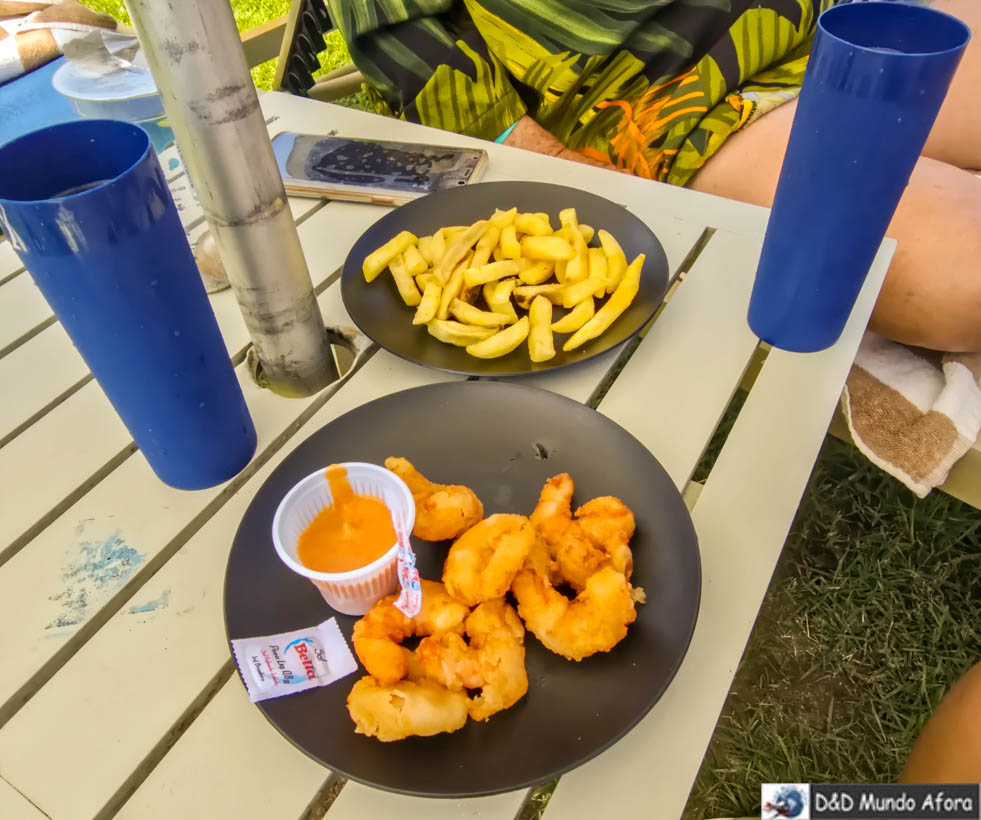 Para comer, pedimos piña colada, água de coco, suco, refrigerante, filezinho com fritas, salmão grelhado com arroz e purê de batata. Tudo deu R$ 340,23.