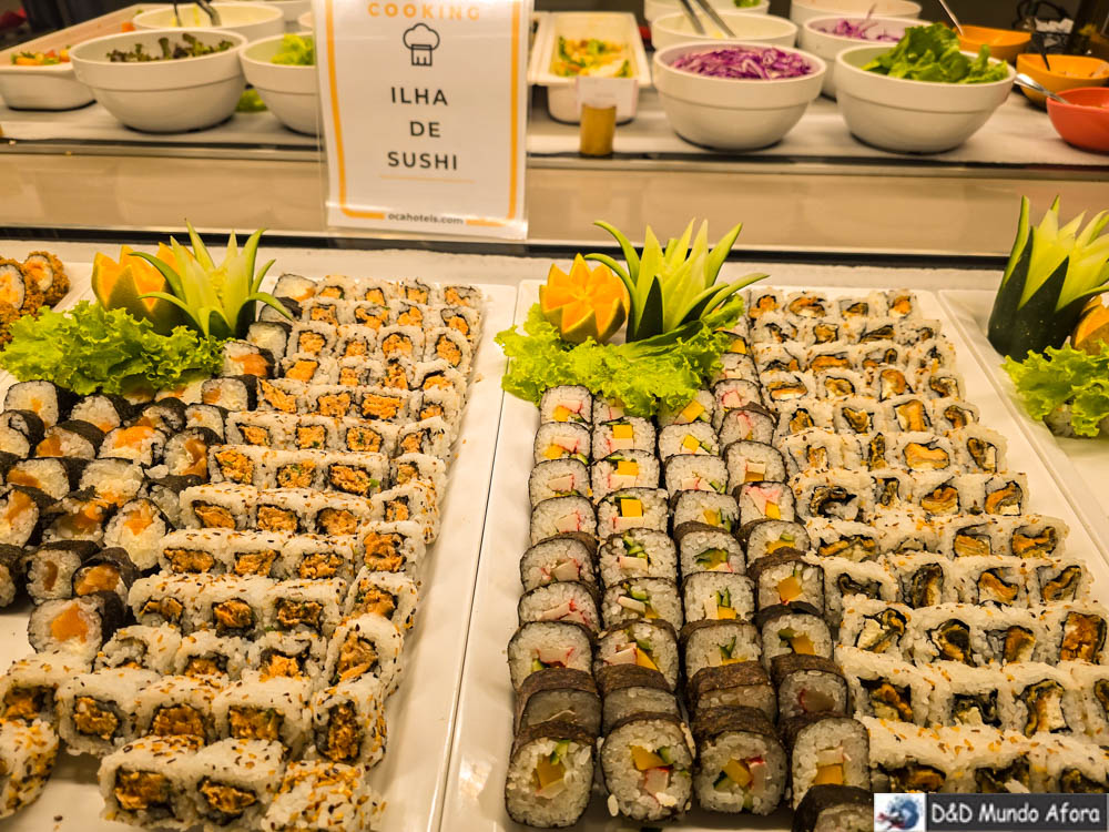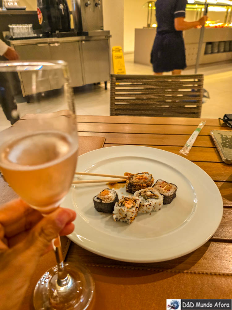 À noite, optamos, novamente, pelos lanches variados para o jantar e Danubia ainda complementou a refeição com muito sushi – às terças-feiras, o restaurante principal inclui comida japonesa no cardápio.