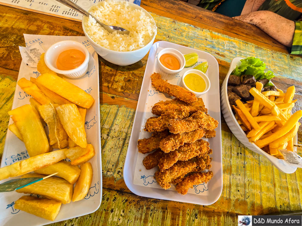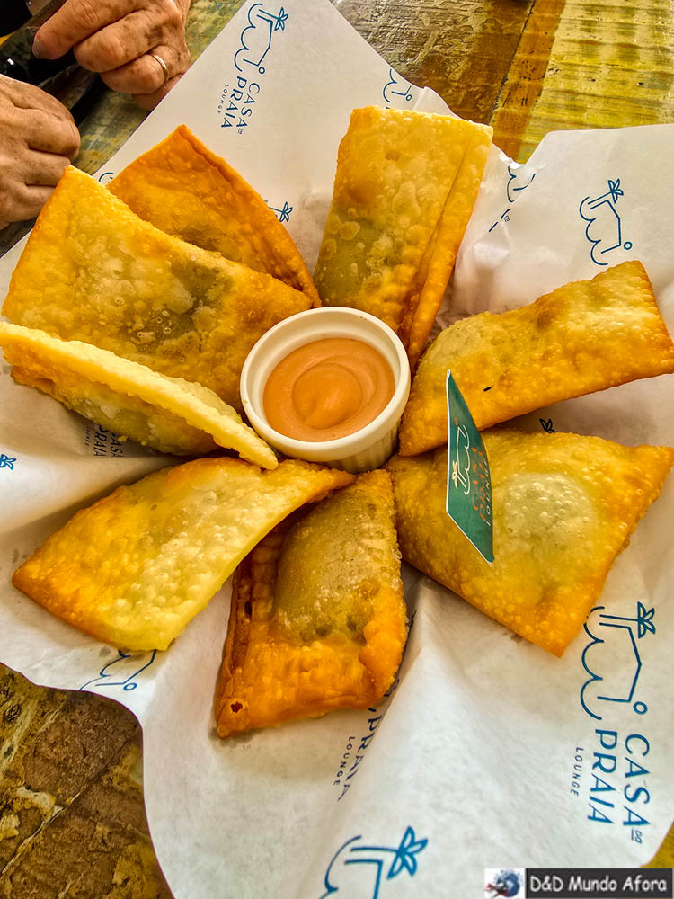Saindo de lá, fomos a pé até o beach club Casa da Praia Lounge e Pizzaria, onde passamos o dia. Pedimos porção de pastéis, piña colada (mamis ama kk), suco, refrigerante, isca de peixe crocante, cubos de filé mignon com batatas fritas e porção de mandioca frita. Tudo deu R$ 407,50 + R$ 90 da taxa de entrada no espaço (R$ 30 por pessoa).