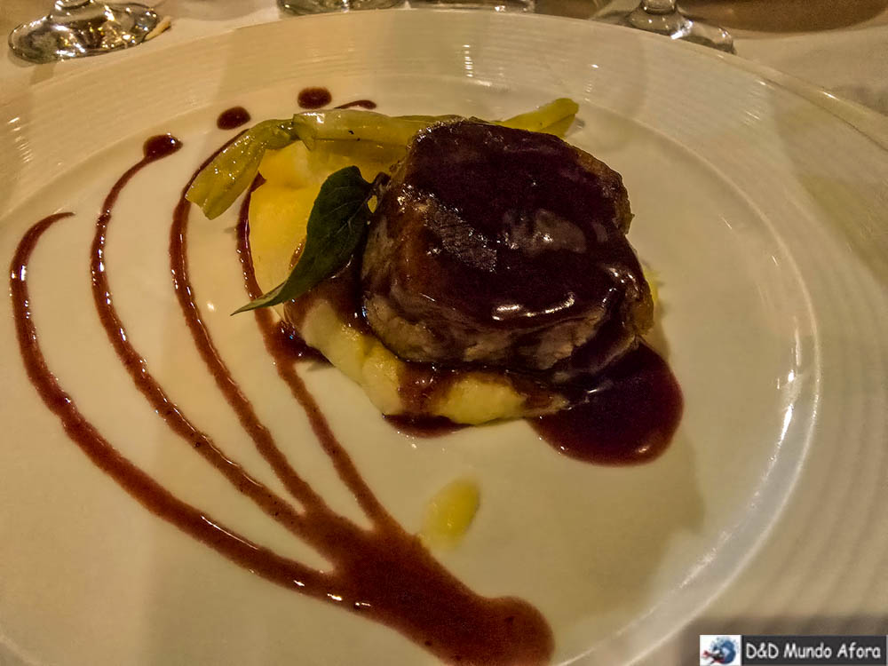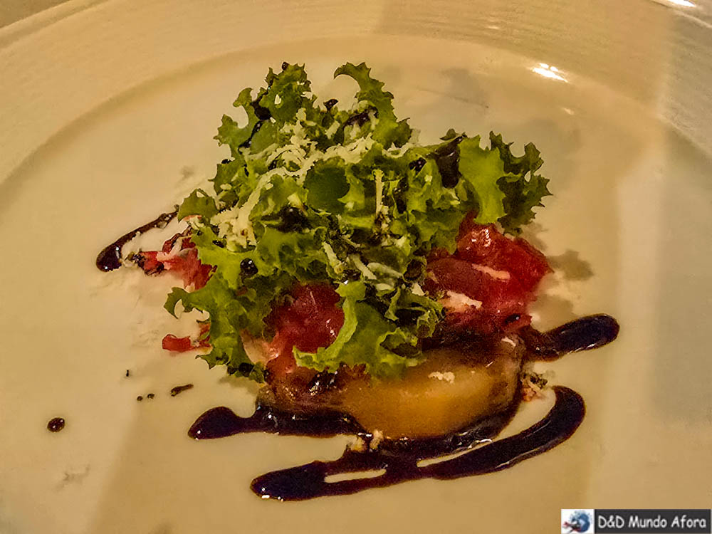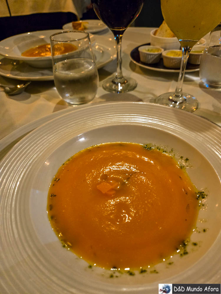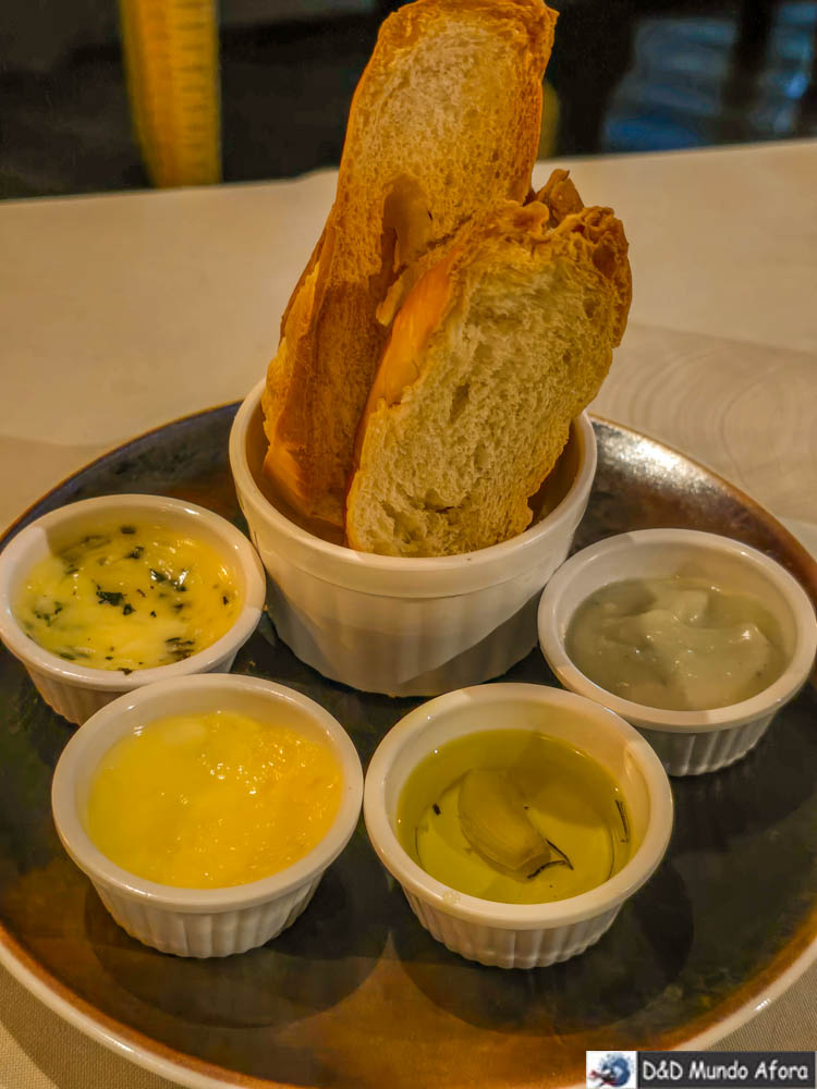 No menu, começamos pelo couvert: torradas acompanhadas de creme de queijo gorgonzola, manteiga de ervas, manteiga de alho e azeite aromatizado com alho e alecrim. De entrada, provamos salada de repolho com chicória, gorgonzola e pera ao vinho branco, além de um delicado creme de abóbora.