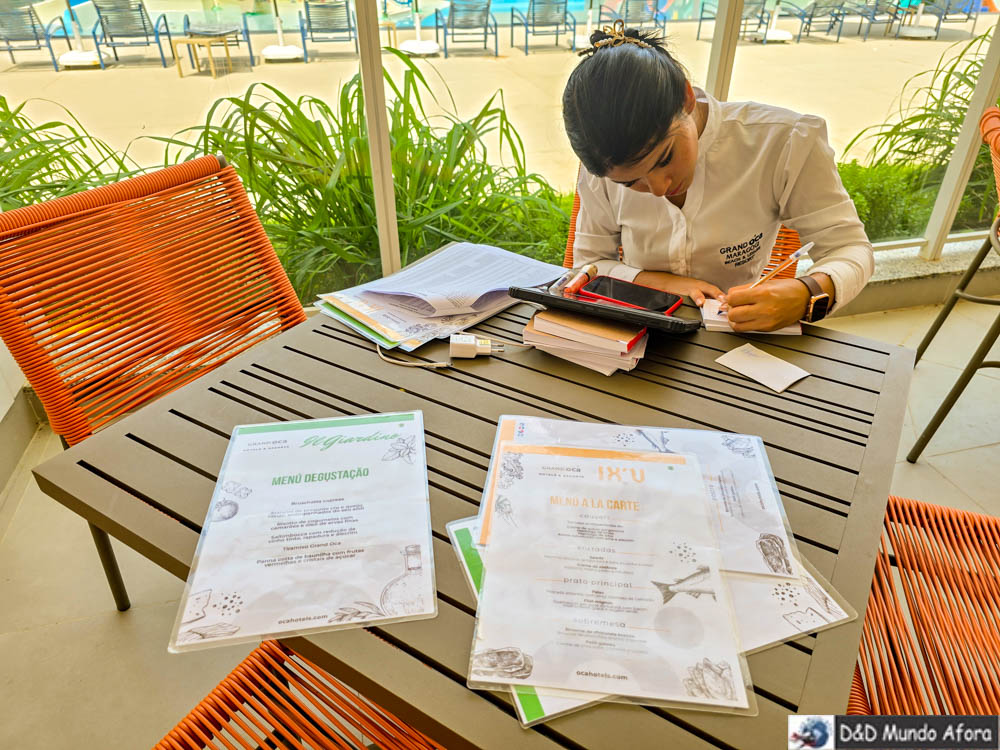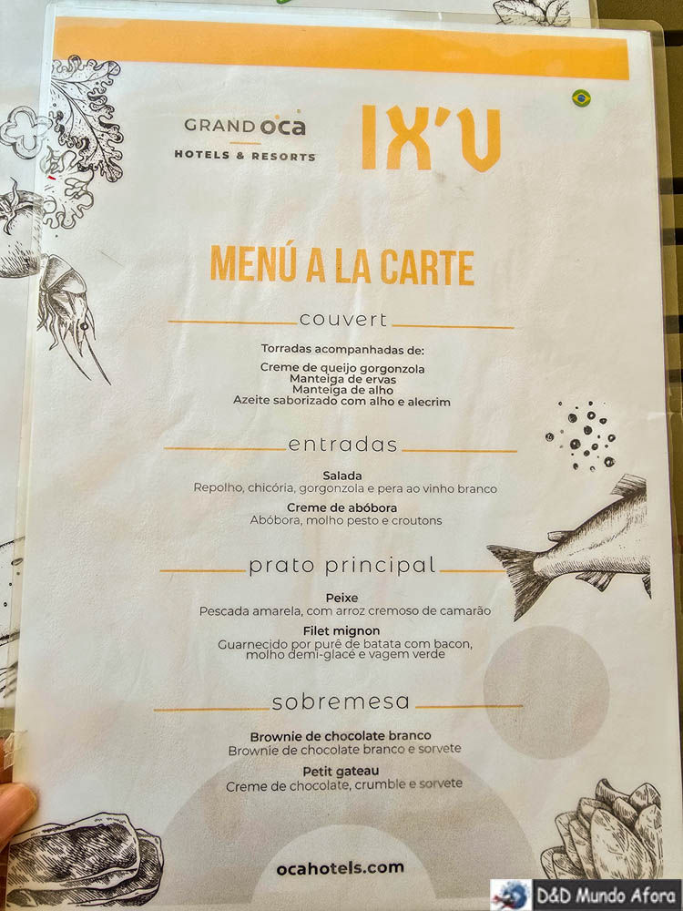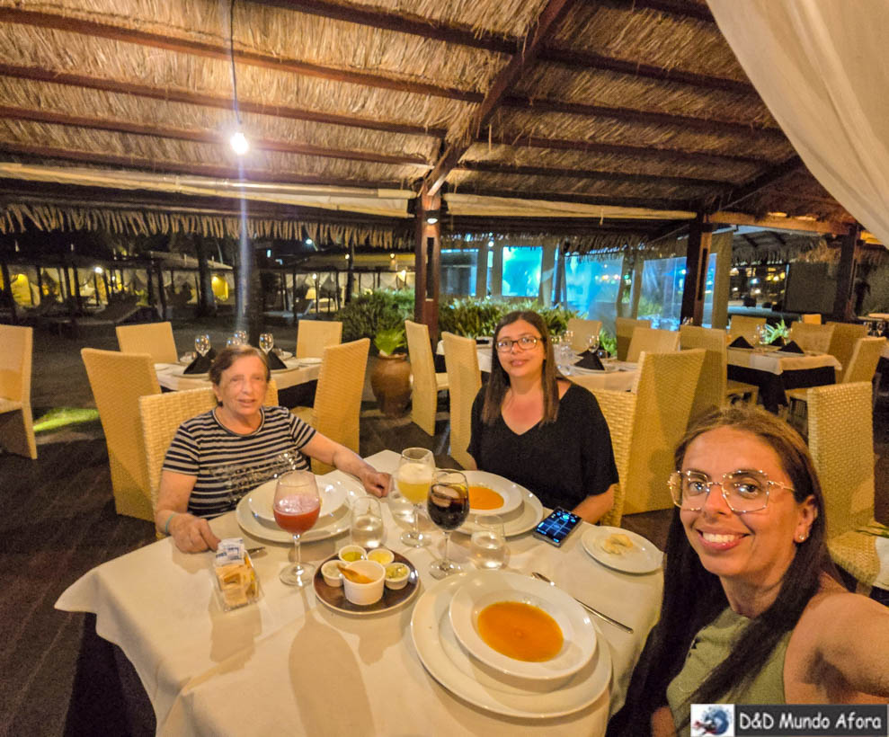 À noite, tivemos um jantar diferente no restaurante Ix’U, de frente para a praia. O serviço é à la carte e, embora faça parte do all inclusive, é necessário reservar com antecedência — nós garantimos a nossa pela manhã. Quem fica até quatro diárias tem direito a uma reserva; a partir de noites noites, são duas. Além do Ix’U, o resort conta também com o italiano Giardino, que já conhecemos em 2023.
