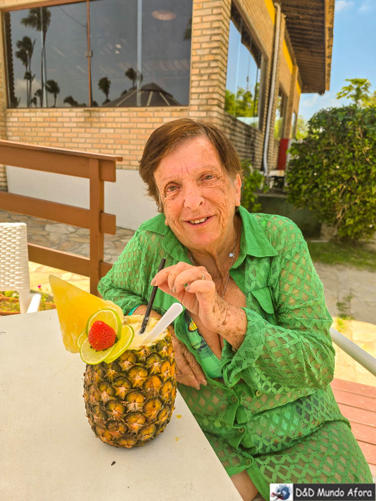 Também aproveitamos para comprar uma piña colada no abacaxi nas jangadas-bares que estavam “estacionadas” nas piscinas naturais (sem água no momento kk) de Ponta de Mangue. Claro que o drink era para mamis e nós levamos para ela no resort.