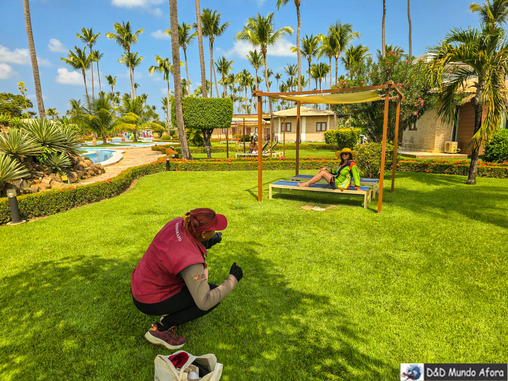 O dia de hoje também teve uma sessão fotográfica super especial. Todo hóspede tem direito a esse benefício gratuitamente e ainda recebe duas fotos impressas sem custo. A experiência dura cerca de 30 minutos, com cliques em dois cenários dentro do resort e também na praia — com direito a chapéu e muito glamour. Nós simplesmente amamos! Aliás, essa já foi a segunda vez que participamos: em 2023 também aproveitamos a sessão.