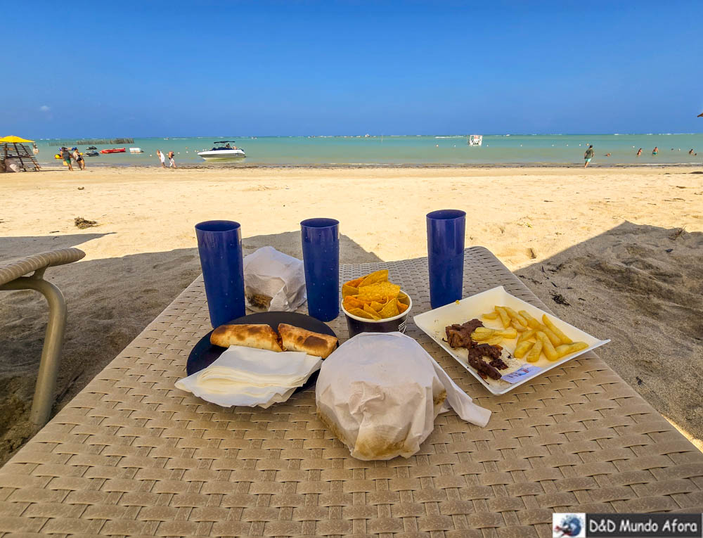 Entre as atividades de hoje, não faltou um banho de mar — água rasinha, quentinha e transparente —, outra caminhada pelo banco de areia (ainda não me acostumei, é surreal como o mar simplesmente desaparece) e, claro, muitos petiscos na praia e à beira da piscina, com direito até a camarão empanado. Muito chique!