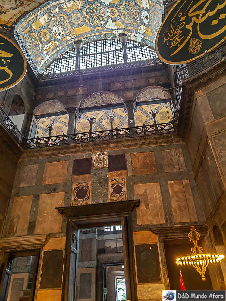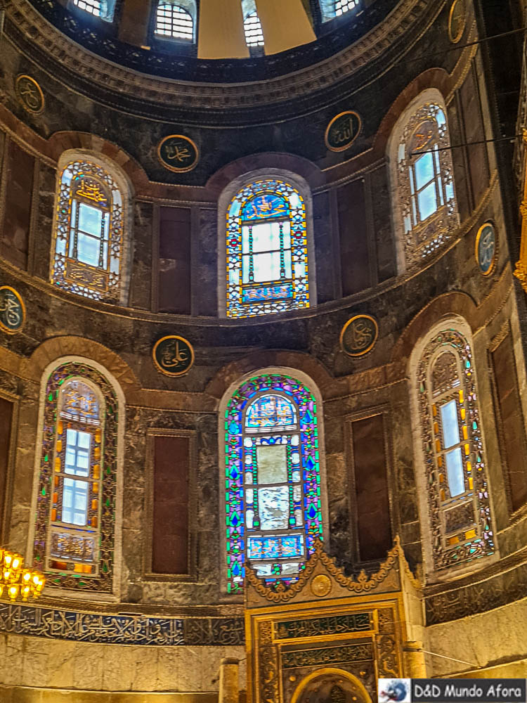 Tem ainda placas enormes de caligrafia islâmica nas paredes. Esse “medalhões” circulares foram adicionados pelos otomanos e contêm os nomes de Alá, Maomé e os quatro califas do Islã.